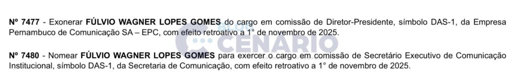 O Diário Oficial deste sábado (15) trouxe a oficialização do que já vinha sendo especulado há alguns dias: a saída de Fúlvio Wagner da presidência da Empresa Pernambuco de Comunicação, para assumir uma função estratégica na comunicação institucional do Estado.