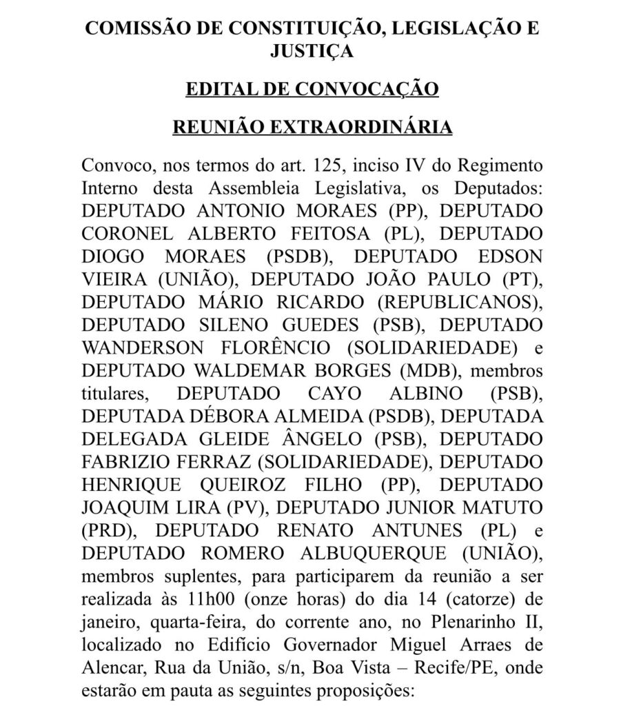 O presidente da Comissão de Constituição, Legislação e Justiça, deputado Coronel Alberto Feitosa (PL), oficializou a convocação da reunião extraordinária para iniciar a análise de três dos quatro projetos enviados em regime de urgência durante o recesso, pela governadora Raquel Lyra (PSD).