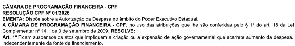 A Câmara de Programação Financeira (CPF), vinculada à Secretaria Estadual da Fazenda, publicou uma resolução estabelecendo um limite interno para a criação ou ampliação de novas despesas fora do orçamento previsto para 2026, no âmbito do Executivo. Conforme documento ao qual o Blog Cenário teve acesso, a medida entrou em vigor nesta sexta (23) e tem efeito imediato.