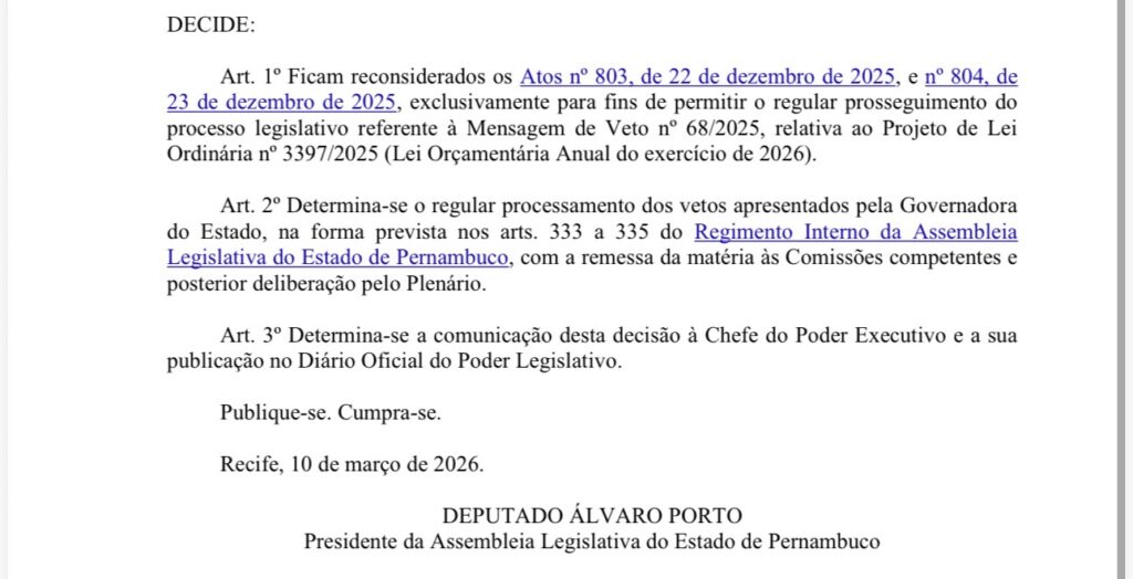 O presidente da Alepe, deputado Álvaro Porto (MDB), assinou nesta quarta (11) um ato legislativo determinando um novo prazo para a tramitação dos vetos à Lei Orçamentária Anual 2026.