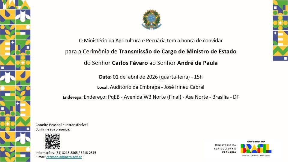 O ministro da Pesca e Aquicultura, André de Paula, assumirá, nesta quarta (1º), o comando do Ministério da Agricultura e Pecuária substituindo Carlos Fávaro (PSD), que vai concorrer a uma vaga no Senado, em uma cerimônia que será realizada no Auditório da Embrapa, em Brasília.