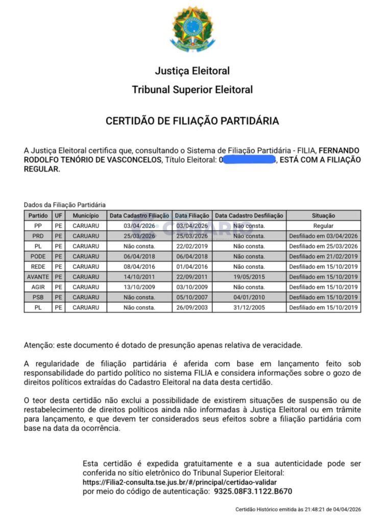 Conforme dados do TSE aos quais o Blog Cenário teve acesso, a filiação de Fernando Rodolfo ao Progressistas foi efetivada ontem (3). Confira: