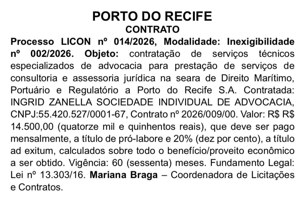 Será necessário, no entanto, que haja republicação do contrato já que neste trecho há uma inconsistência de informações, citando dois percentuais distintos para os honorários. O Blog Cenário chegou a buscar, de forma exaustiva, o próprio contrato e outros documentos do processo para obter os dados corretos, mas levando em conta a defasagem do Portal da Transparência do Porto do Recife, nenhuma publicação foi encontrada. Também não há nada relacionado no Portal PE Integrado, sistema de compras do Governo de Pernambuco. O documento firmado com o escritório de Ingrid é assinado pela coordenadora de licitações e contratos do porto, Mariana Braga.