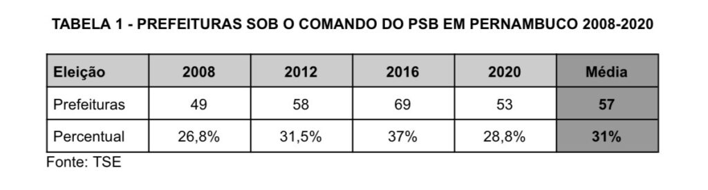Considerando o resultado das eleições municipais de 2008, 2012, 2016 e 2020 – período no qual o PSB estava no comando do estado com Eduardo Campos e Paulo Câmara – verifica-se uma média de 31% das prefeituras sob o comando do partido do governador.