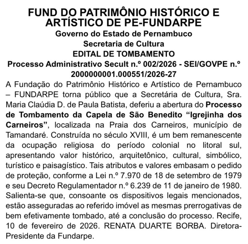 O edital de tombamento foi divulgado nesta sexta (13). O documento é assinado pela presidente da Fundarpe, Renata Borba, e com a publicação, a igreja já passa a contar com tombamento provisório. Até a conclusão do processo, o imóvel permanece protegido como se fosse definitivamente tombado. A autorização para a abertura do processo foi dada pela secretária de Cultura, Cacau de Paula.